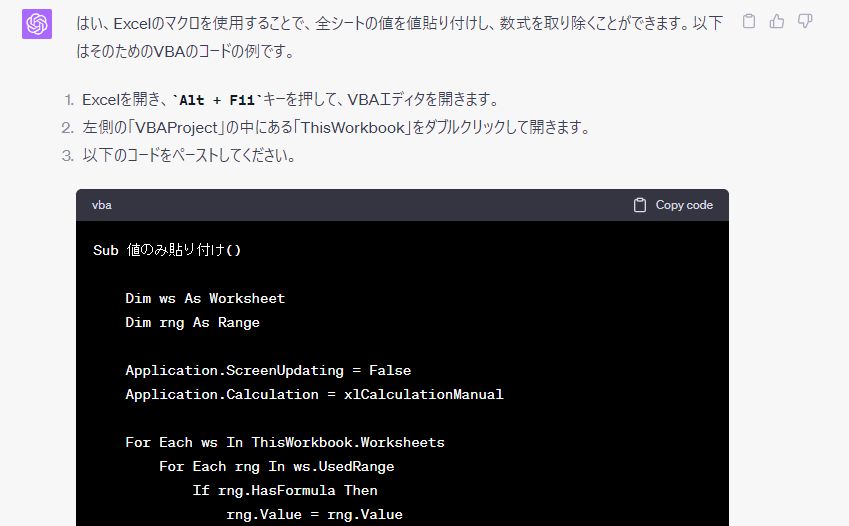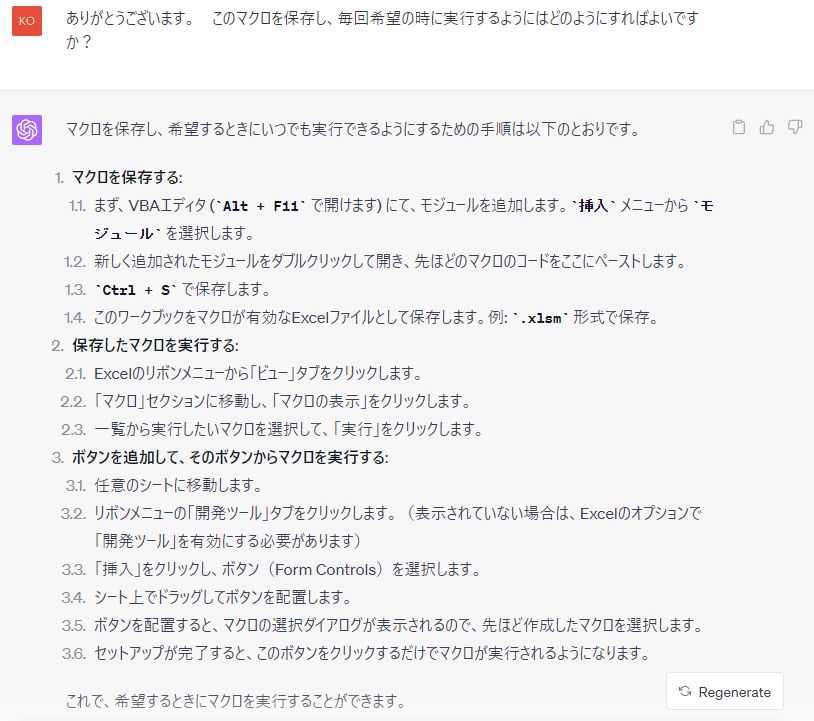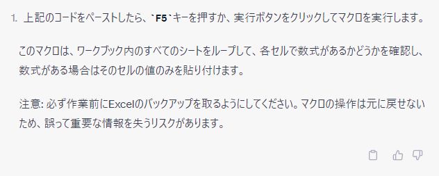 今回はマクロの作成手順や登録手順は質問に含んでいなかったのですが、AIが意図を組んでくれたのか手順も合わせて答えてくれました。