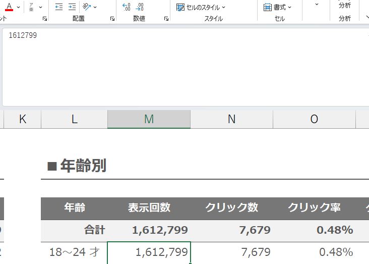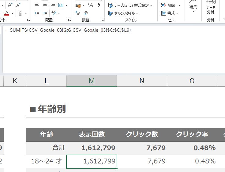 一例で、年齢別のレポートのタブがあるのですが、表示回数の所にカーソルを合わせるとSUMIFS関数でCSVデータから18~24才の数値を合計しています。