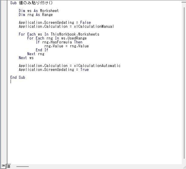今回の希望はこの数式を自動で値貼り付けする事なので、先ほどAIが記載してくれた手順でマクロを作成していきます。