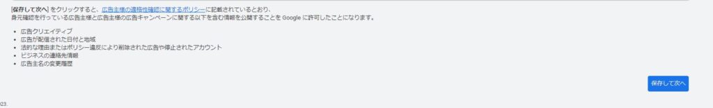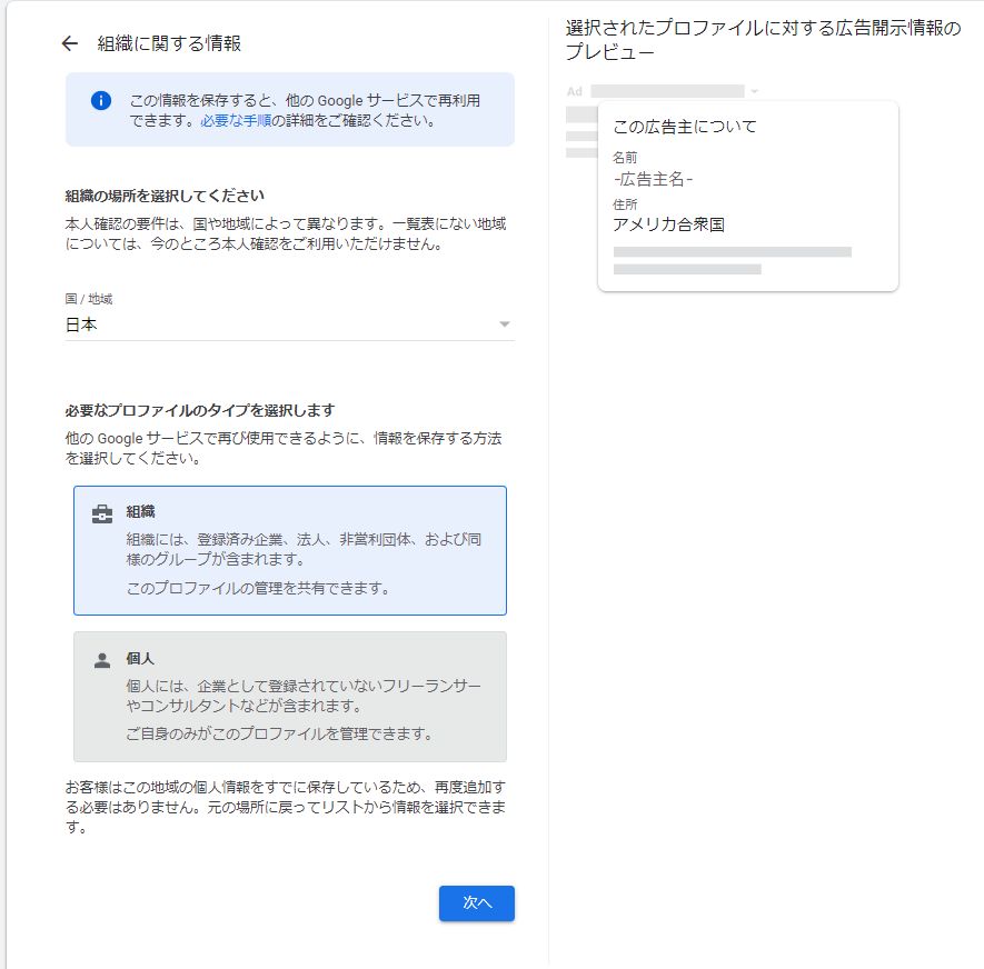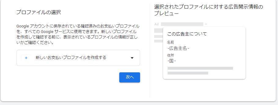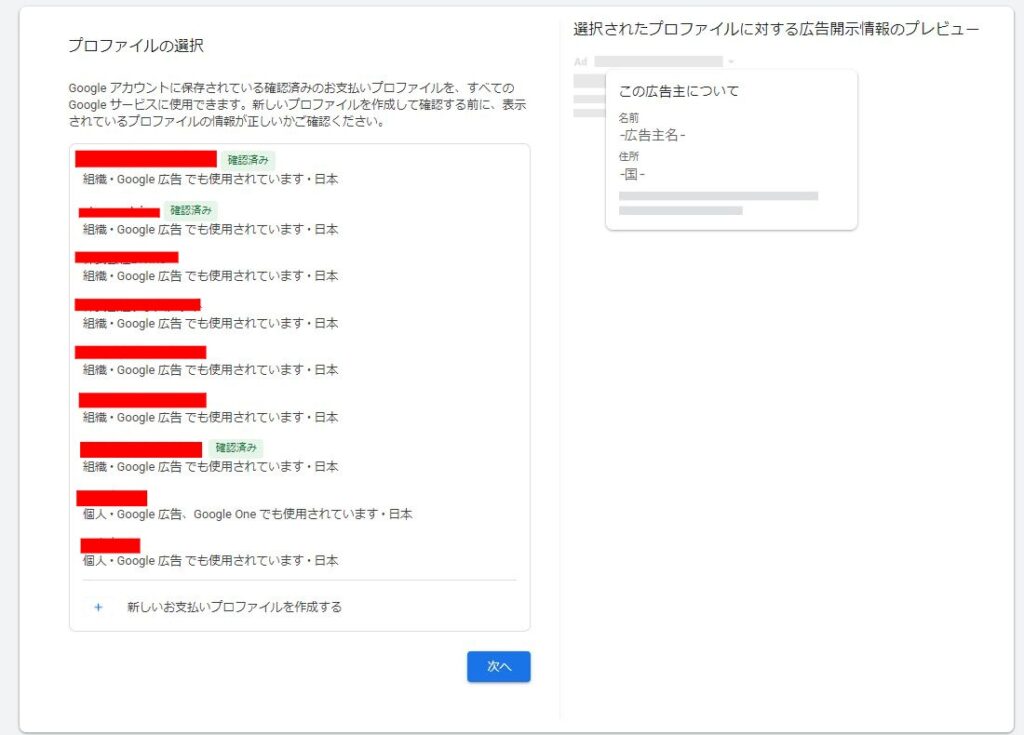 最終的に広告主の身元を確認し、開示情報に広告主名を記載したい場合、ここで支払いに利用している自社(代理店)のプロファイル情報を設定してしまうと最終的に代理店情報が表示されることがあるのでご注意ください。