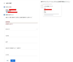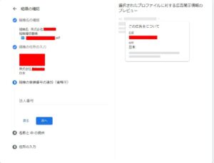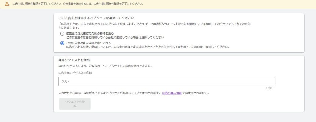 ・確認リクエストを作成:正式な広告主のビジネス名を入力(謄本記載の法人名など)