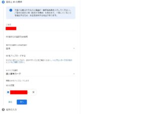 提出する個人の確認書類に記載する氏名をそのまま入力し、合わせて確認書類をアップロードします。