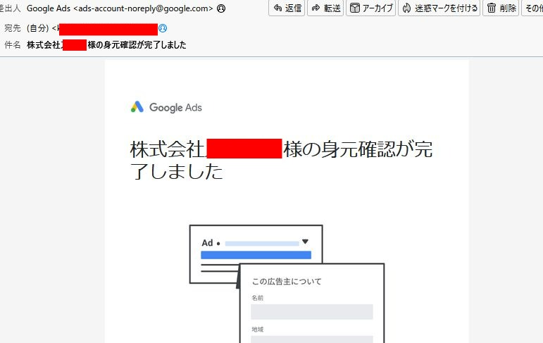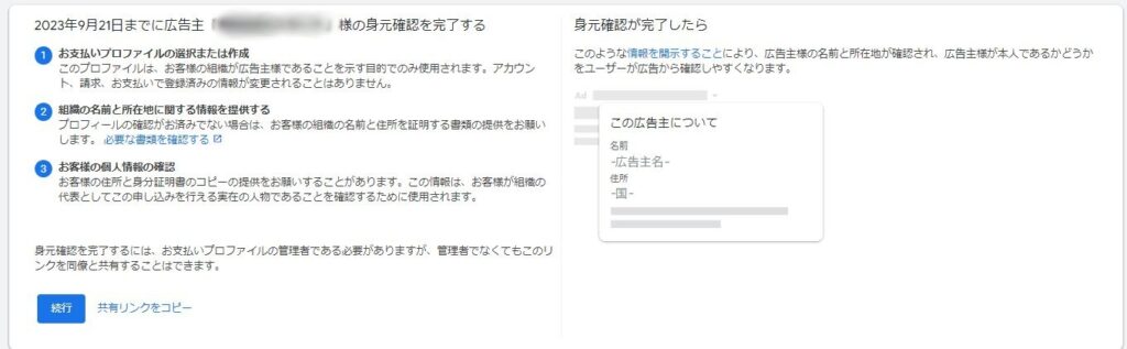 このような通知がGoogle広告からメールや管理画面上で通知が届くことがありますが、その場合には指定の期間内に広告主の身元確認作業を完了させなければいけません。