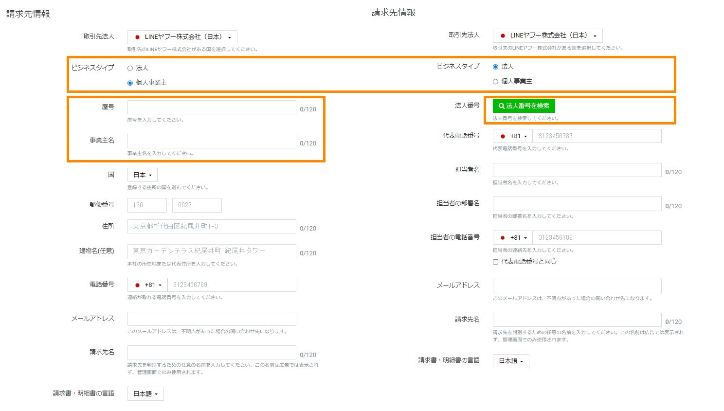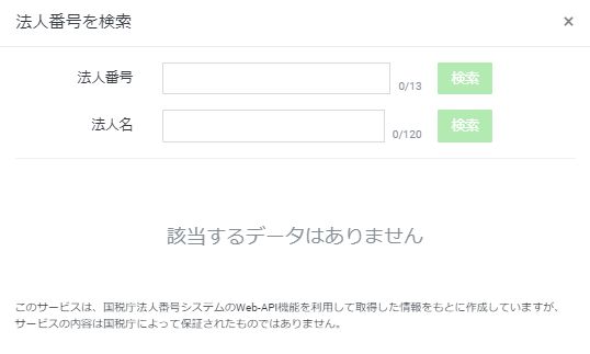 ビジネスタイプで「法人」を選択した場合は、「法人番号を検索」から自社の法人番号または法人名を入力した後に検索して選択することで入力を一部省略することが可能です。