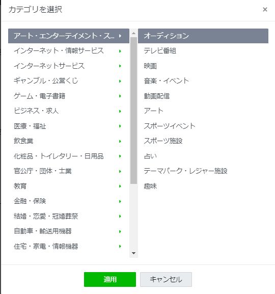 「カテゴリを選択」をクリックすると下記のような業種を選択する画面になるので、配信する商材に沿ったカテゴリを選択し、「適用」しましょう。