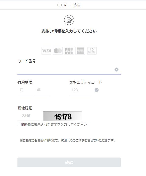 アカウント作成後、広告費を支払うためのクレジットカード情報の登録画面となるので、任意のクレジットカードを登録しましょう。