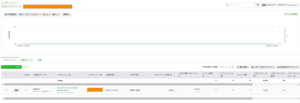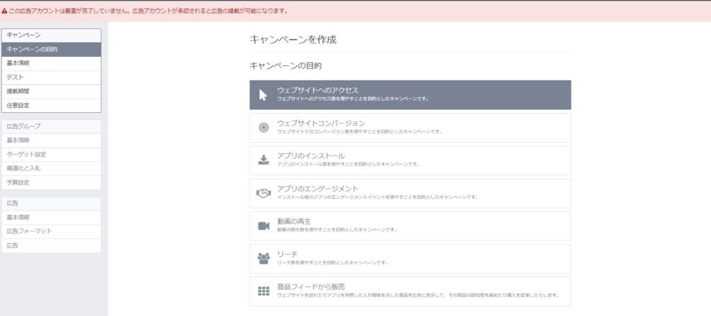 クレジットカード登録を完了させると広告アカウントの画面になるため、そのまま広告の作成まで進めます。