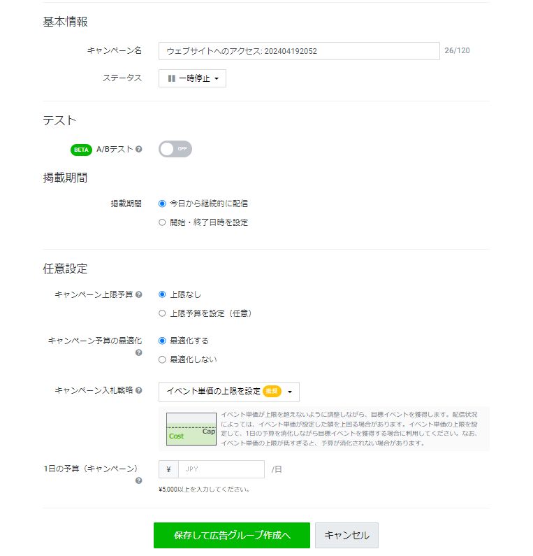 キャンペーンで設定した目的をどのように最適化していくかの設定と、一日/期間の配信予算などの設定。