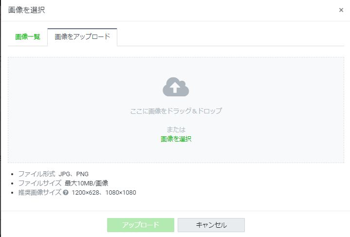 画像をアップロードする画面が表示されるので、ここからドラッグ&ドロップまたはファイルから画像をアップロードしましょう。