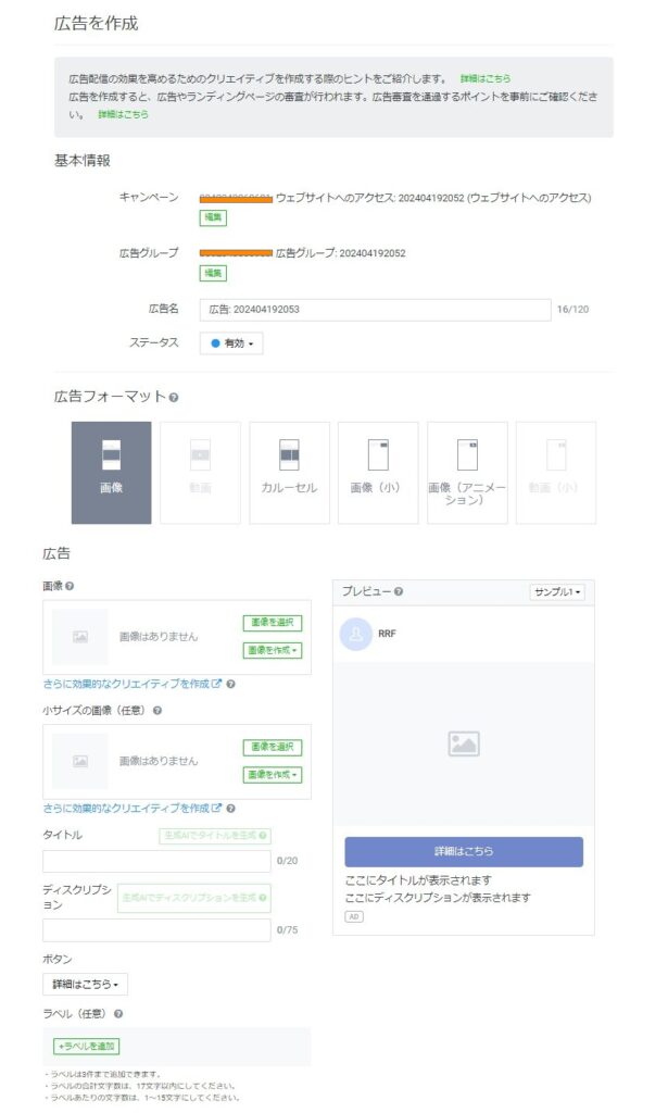 実際に画像を登録し、広告文を入力した状態が下記になります。