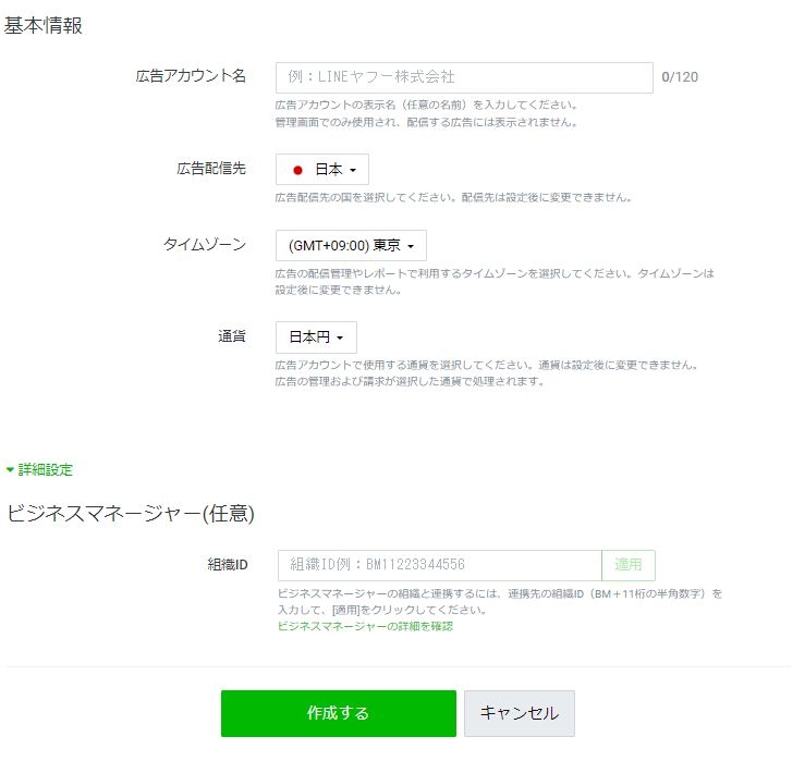 詳細設定は「ビジネスマネージャーID」を所持している場合には入力する事で、広告アカウントの管理を行いやすく、諸々の連携も可能となりますが、今回は初めての方を想定としている為割愛します。